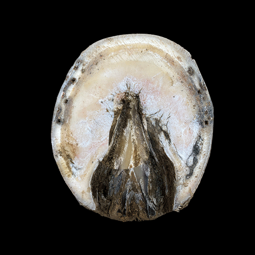 How you support the hoof is always a consideration when changing the shoeing due to lamness or gait problems. After establishing the choice of shoe for the presciption, find the most vulnerable area on the hoof that may be compromised or sensitive and needing support. An example that is very common is a hoof that has a low angle and thin sole. There are many ways to work with this problem. Ask yourself where is the sensitivity and determine the proper balance from how the hoof is landing and leaving the ground. Again, have a vision of the direction you want to hoof to be in now and the next four weeks and beyond. The shoe used above is very thick so additional hoof support is needed.
