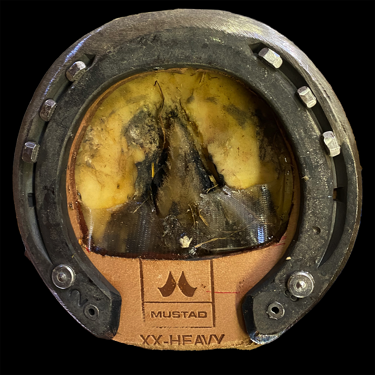 It can be seen from these two mouseover images above that the hoof presented for shoeing has a very quick breakover. Pay attention to the distance from the point of the frog to the toe of the shoe. The horses stride is substantially shorter with this style of shoeing. The before picture shows that the shoe was set back significantly with a broad toe box to increase the speed and direction of breakover causing the hoof to travel vertically quickly as soon as the hoof leaves the ground. In the final view (mouseover image to see final shoe application) a more normal breakover to correct the hoof flight. The hoof flight will be changed significantly to be a lower and longer trajectory. Of course, this changed increases the length and quality of the stride. Try to investigate the reasoning for the excessive setback of the shoe. Is it solely to keep the shoe from being pulled? Is there a lamness that is the concern? Answer these questions before changing to a more perimeter fit. Making the change will definitely give the horse an easy, appealing gait for pleasure or show.